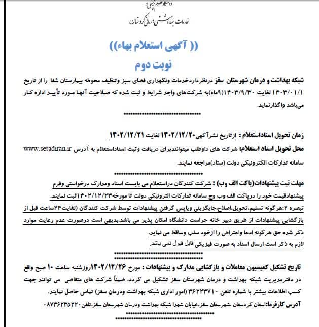 به استحضار می رساند که شبکه بهداشت ودرمان شهرستان سقز درنظر دارد امورات فضای سبز بیمارستان شفا شهرستان سقز را درسال 1404-1403(نوبت دوم) به شرکتهای واجد شرا یط (از طریق استعلام بهاء) وا گذار نماید.