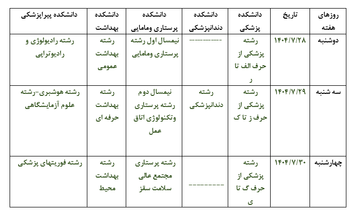 پس از ثبت نام اینترنتی صرفا جهت تحویل اصل مدارک بر اساس جدول زمانبندی ذیل به آدرس کردستان ـ سنندج ـ بلوار پاسداران ـ پایین تر از بیمارستان قدس - روبروی هتل شادی ـ پردیس دانشگاه علوم پزشکی و خدمات بهداشتی درمانی کردستان مراجعه نمایند.