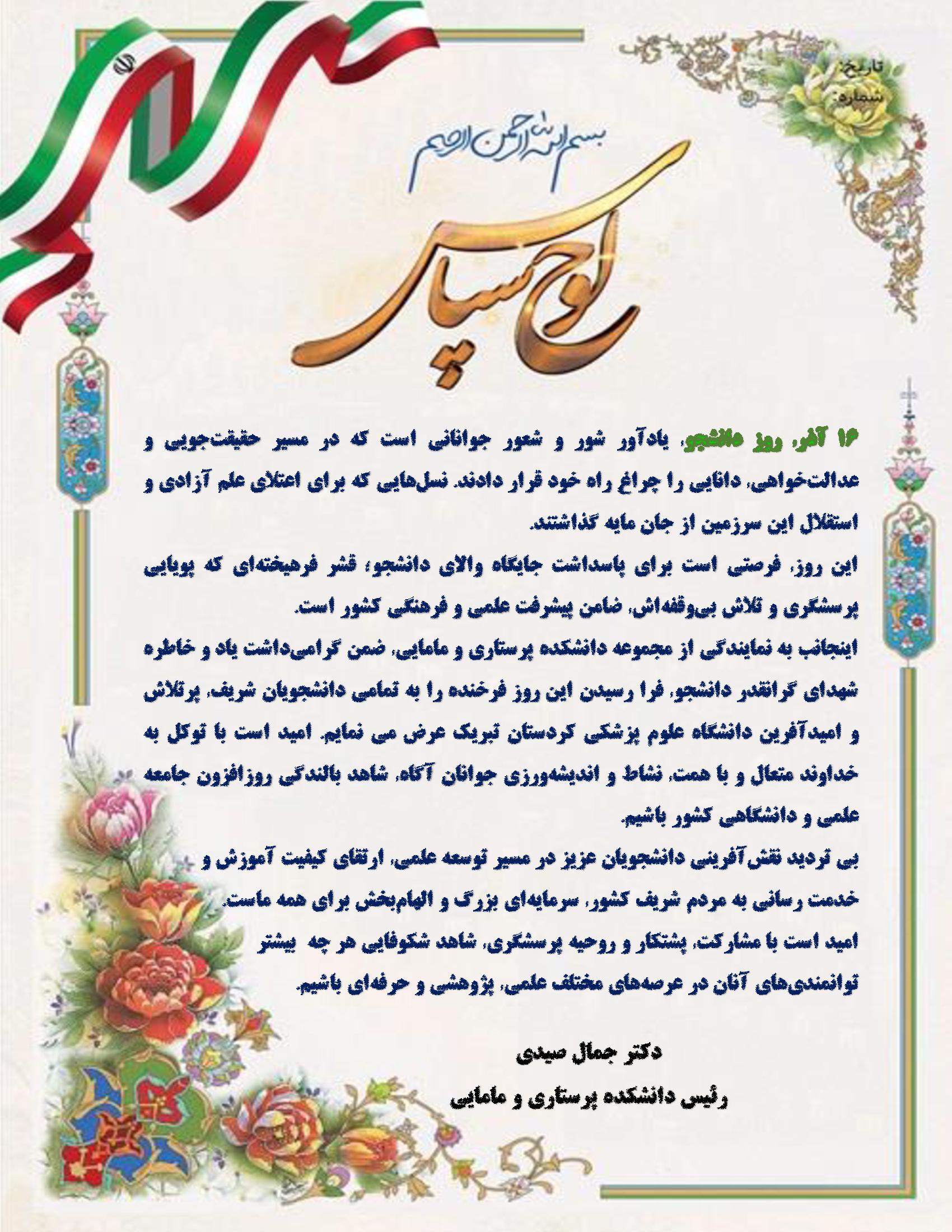 اینجانب به نمایندگی از مجموعه دانشکده پرستاری و مامایی، ضمن گرامیداشت یاد و خاطره شهدای گرانقدر دانشجو، فرا رسیدن این روز فرخنده را به تمامی دانشجویان شریف، پرتلاش و امیدآفرین دانشگاه علوم پزشکی کردستان تبریک عرض می نمایم. امید است با توکل به خداوند متعال و با همت، نشاط و اندیشهورزی جوانان آگاه، شاهد بالندگی روزافزون جامعه علمی و دانشگاهی کشور باشیم.