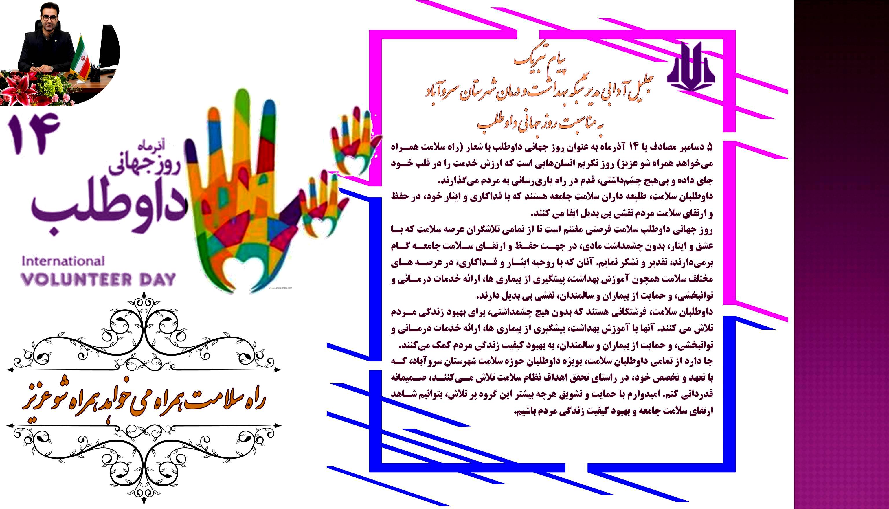 به مناسبت روز داوطلب سلامت جلیل آدابی مدیر شبکه بهداشت و درمان شهرستان سروآباد پیام تبریکی منتشر کردند