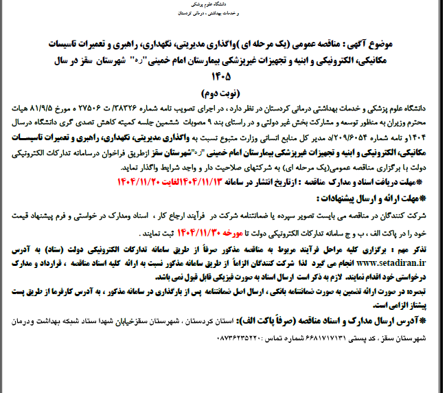 واگذاری مدیریتی، نگهداری، راهبری و تعمیرات تاسیسات مکانیکی، الکترونیکی و ابنیه و تجهیزات غیرپزشکی بیمارستان امام خمینی"ره "شهرستان سقز در سال 1405(نوبت دوم)