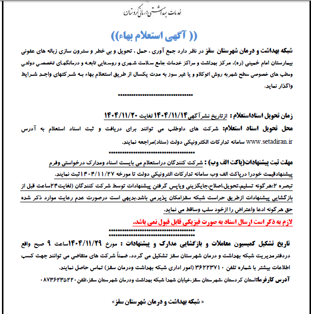 شبکه بهداشت ودرمان شهرستان سقز درنظردارد امورات سترون وبیخطرسازی پسماند عفونی بیمارستان امام خمینی"ره" سقز(نوبت اول) را درسال 1405به شرکتهای واجد شرا یط (از طریق استعلام بهاء )واگذارنماید