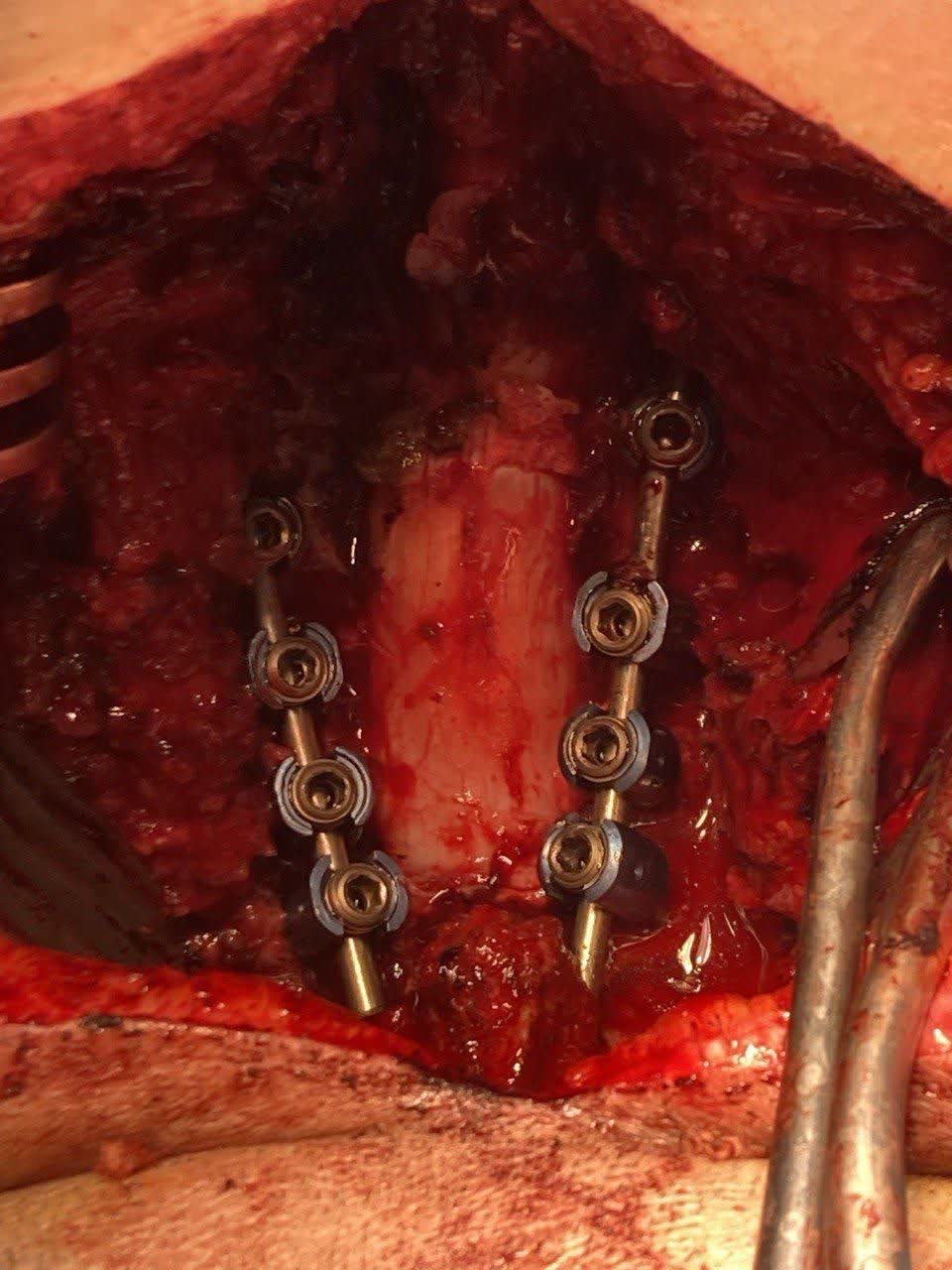 دکتر محمدی ادامه داد: ۷۲ ساعت پس از جراحی اول، بیمار مجدداً به اتاق عمل منتقل شد. در مرحله، تیم جراحی با انجام «لامینکتومی» از مهره سوم تا ششم (C3-C6)، فشار را از روی بخش پشتی نخاع برداشتند و با استفاده از سیستم «پیچ و راد» (Screw and Rod) در ۸ نقطه مختلف، پایداری کامل ستون فقرات بیمار بدست آمد.