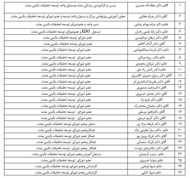 لیست اعضای شورای پژوهشی واحد توسعه تحقیقات بالینی بیمارستان بعثت 1401