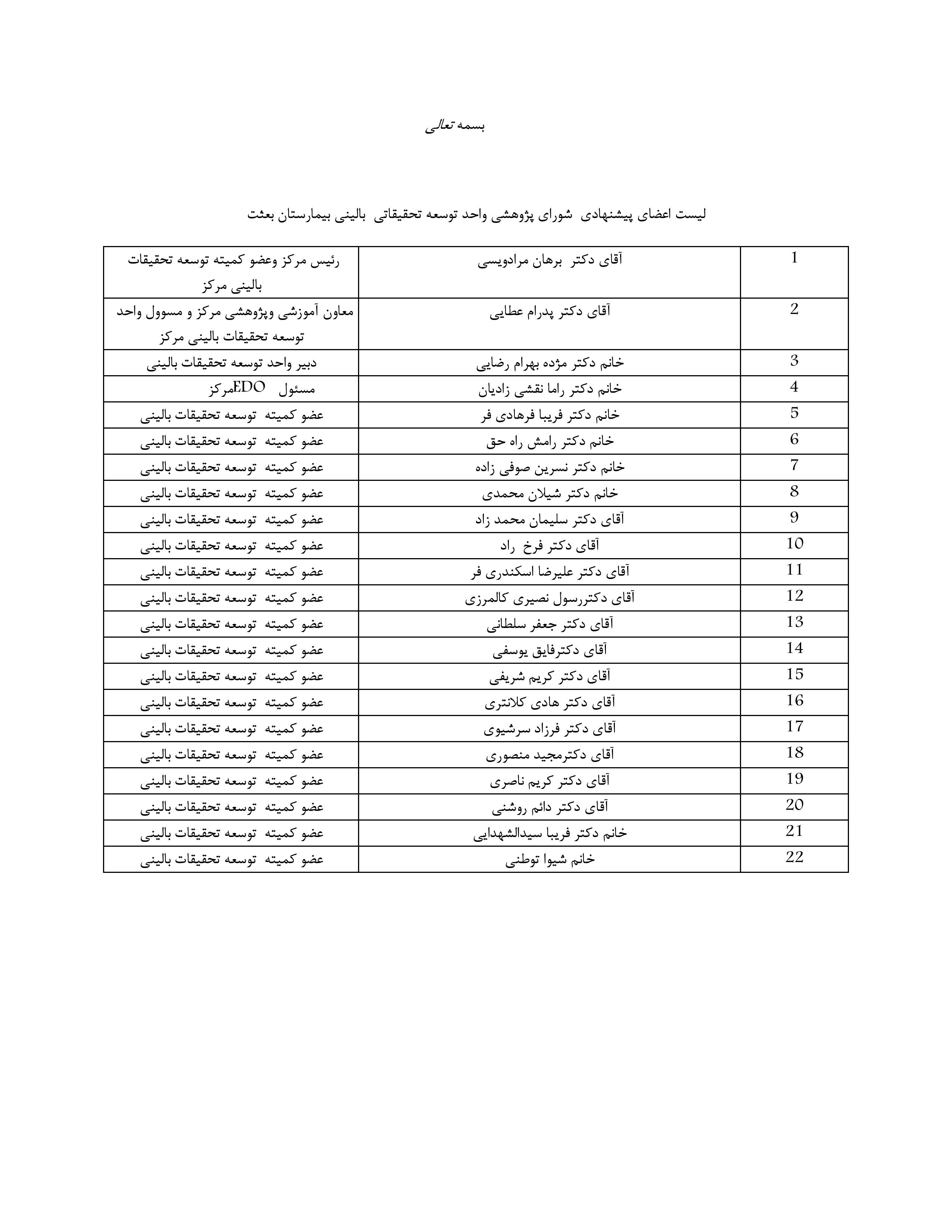 لیست اعضای شورای پژوهشی واحد توسعه تحقیقات بالینی بیمارستان بعثت 1403